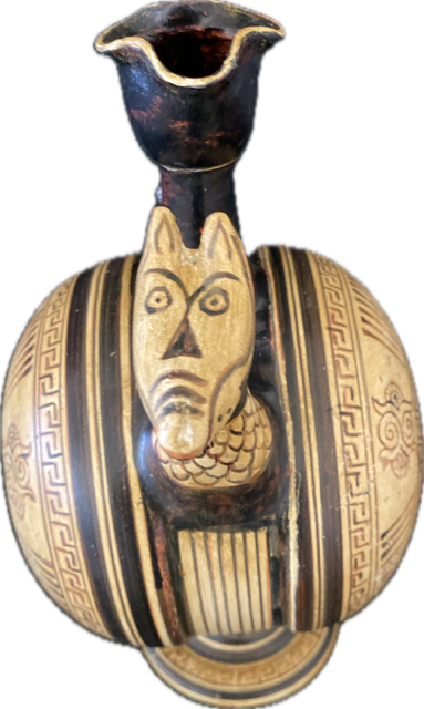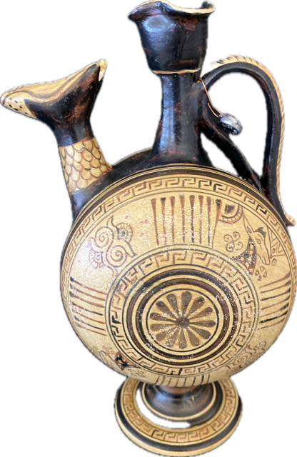 Athenian geometric barrel-shaped Prochous vase, decorated with flower, animal head and geometric motives.