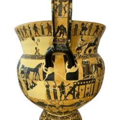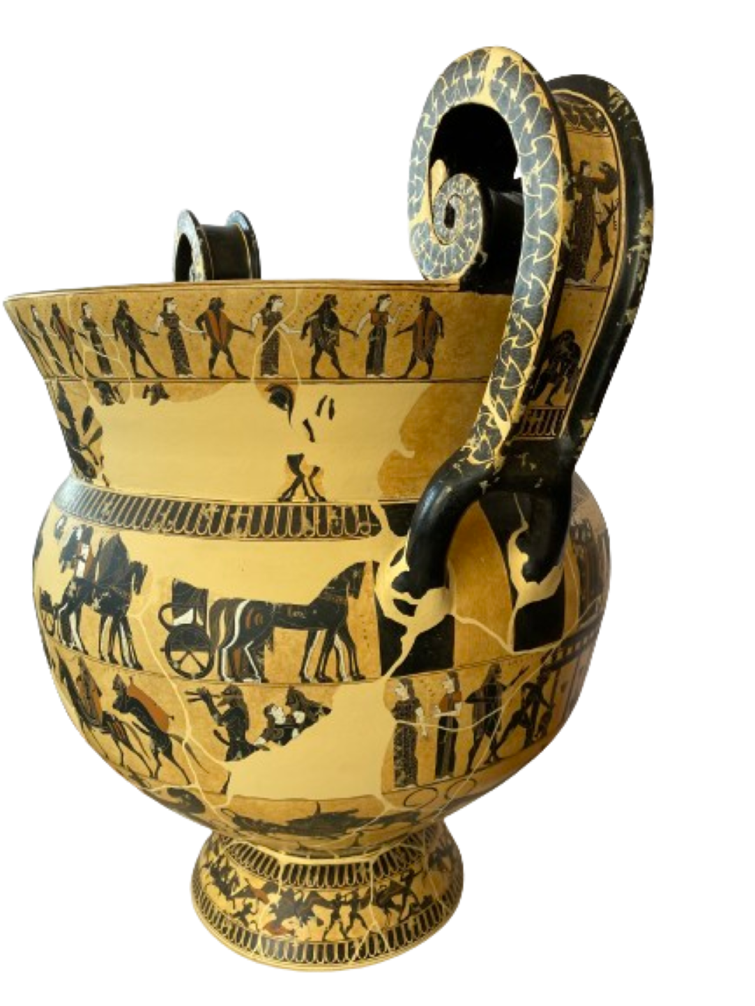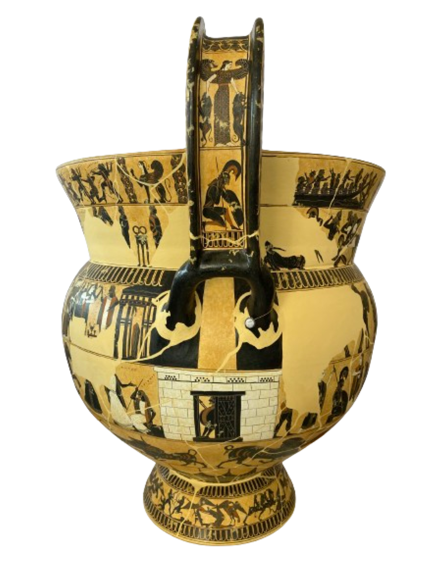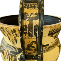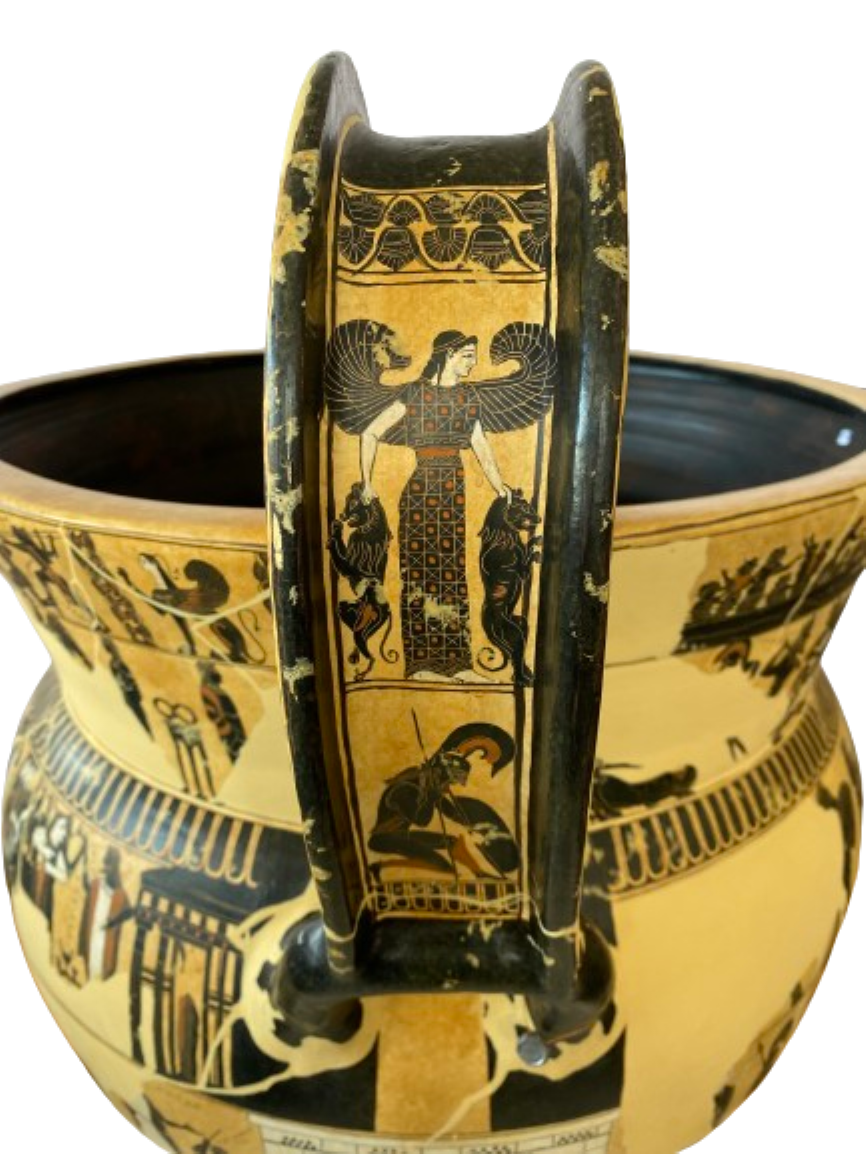 The handles are decorated as well, showing on their outer sides the so-called Mistress of Animals above a vignette showing Ajax carrying the dead Achilles. The fields on the inner sides of the handles above the rim of the pot each feature a Gorgon in motion.