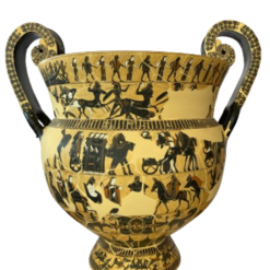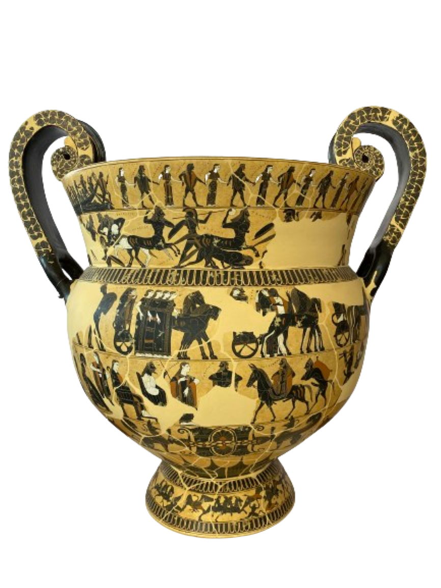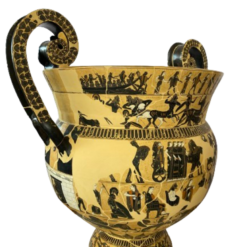 The fourth frieze on side A depicts the ambush of Troilus by Achilles. Side B shows the return of Hephaestus to Olympus; sitting on a mule, he is led to the Olympian gods by Dionysus, followed by a group of silens and nymphs.