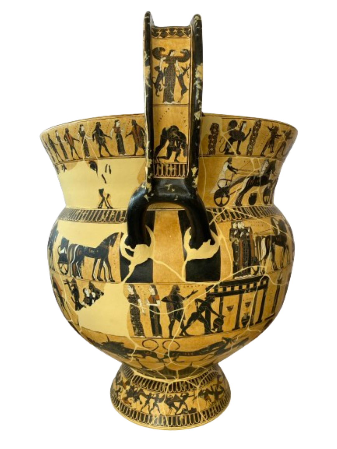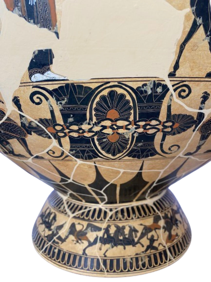 The second band on side A shows the chariot race which is part of the funeral games for Patroclus, instituted by his friend Achilles, in the last year of the Trojan War. Here, Achilles is standing in front of a bronze tripod, which would have been one of the prizes, while the participants include the Greek heroes Diomedes and Odysseus. On side B, the painted scene depicts a battle of the Lapiths and Centaurs. The most famous of these conflicts took place at the wedding party of Pirithous and Hippodamia, which is probably depicted here, as the hero Theseus is found among the combatants, a friend of Pirithous who himself was not a Lapith, but said to be among the wedding guests. The scene also includes the demise of the Lapith hero Caeneus.