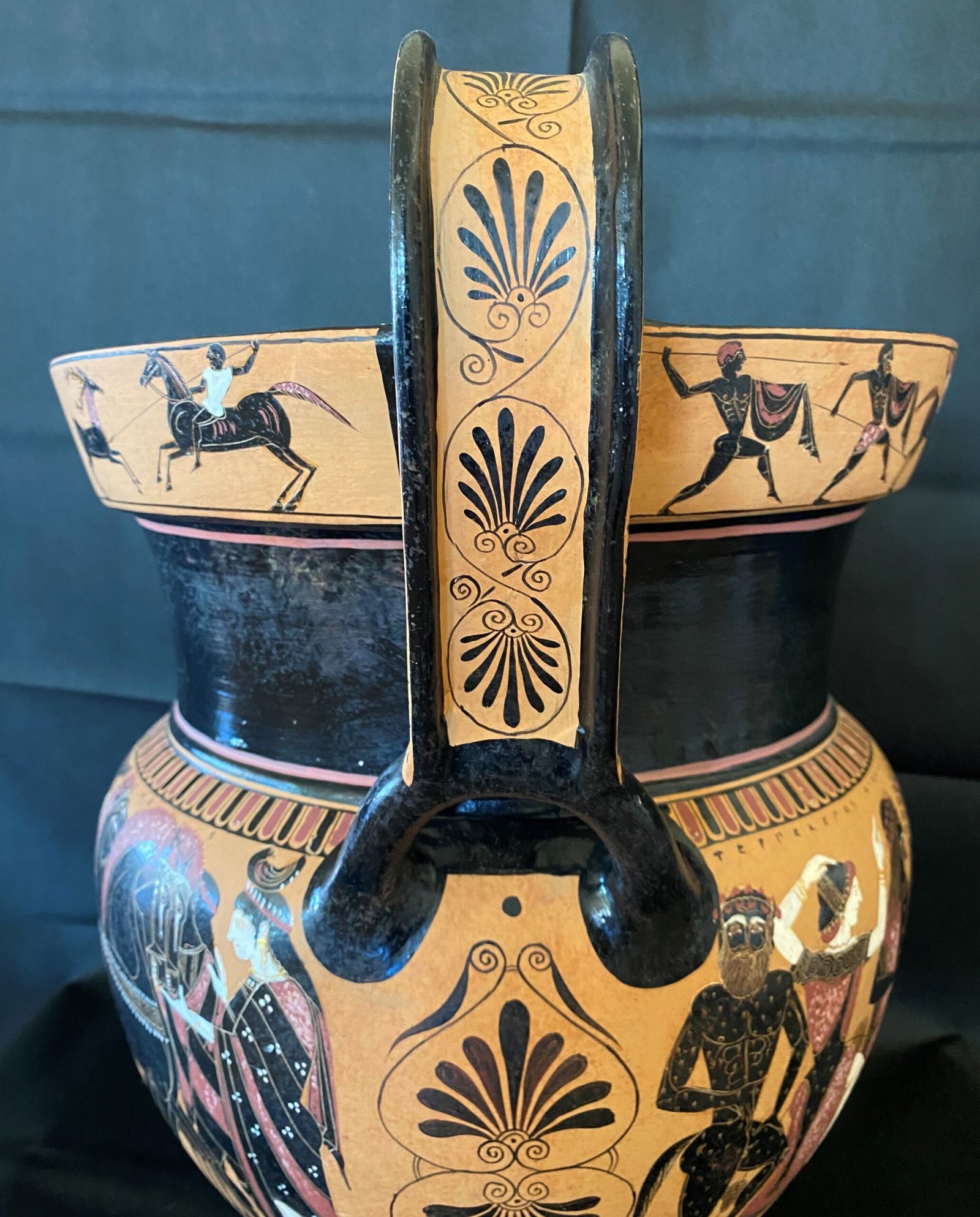 On the rim of the vase, scenes of wild boar – deer hunting, by hunters on horseback, can be seen.