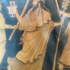 On one side of the neck of this mixing bowl (krater), the mythical Adonis reclines on a couch, with a diminutive figure of Eros perched before him holding a dish of fruits. On either side are Aphrodite, the goddess of love, and Persephone, the queen of the Underworld, with their female attendants. Aphrodite fell in love with the handsome Adonis, but he was killed during a boar hunt soon after. The goddess was so distraught that Zeus, the king of the gods, made the youth immortal, allowing him to leave Hades, the underworld of the dead, for part of the year to be with Aphrodite. He always, however, had to return to Hades, where he was Persephone’s lover. This cycle of death and rebirth was linked to the regeneration of vegetation and the crop seasons in ancient Greece. Adonis was of Phoenician origin, and his cult was introduced to Athens in about 440 B.C.; its devotees were exclusively female.