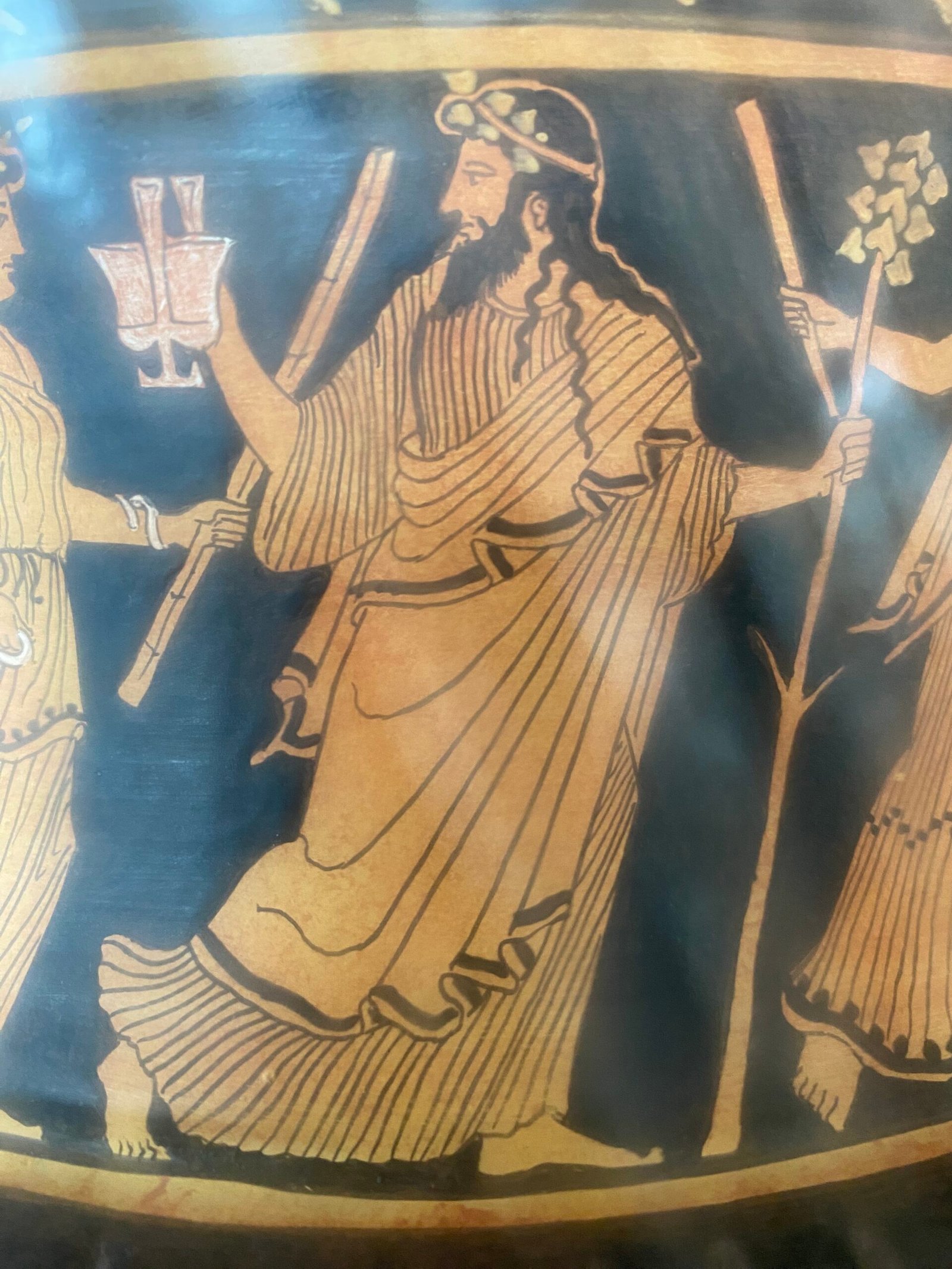 The bowl rests upon an elaborate stand, the missing part of which has been reconstructed. Decorating the upper surface of the base is a series of hunts featuring both real and mythological animals (deer, bull, hare, griffins). Running around the side is a scene of Dionysos and his entourage. The god of wine holds out a drinking vessel as he reclines on a couch, and Eros stands before him. Dionysos is accompanied by a group of satyrs and maenads, who dance, cavort, or in one case, attempt to catch a hare. The two figures striding arm in arm at the head of the procession have been seen as Apollo leading Sabazios, a Phrygian divinity associated with Dionysos and Zeus.