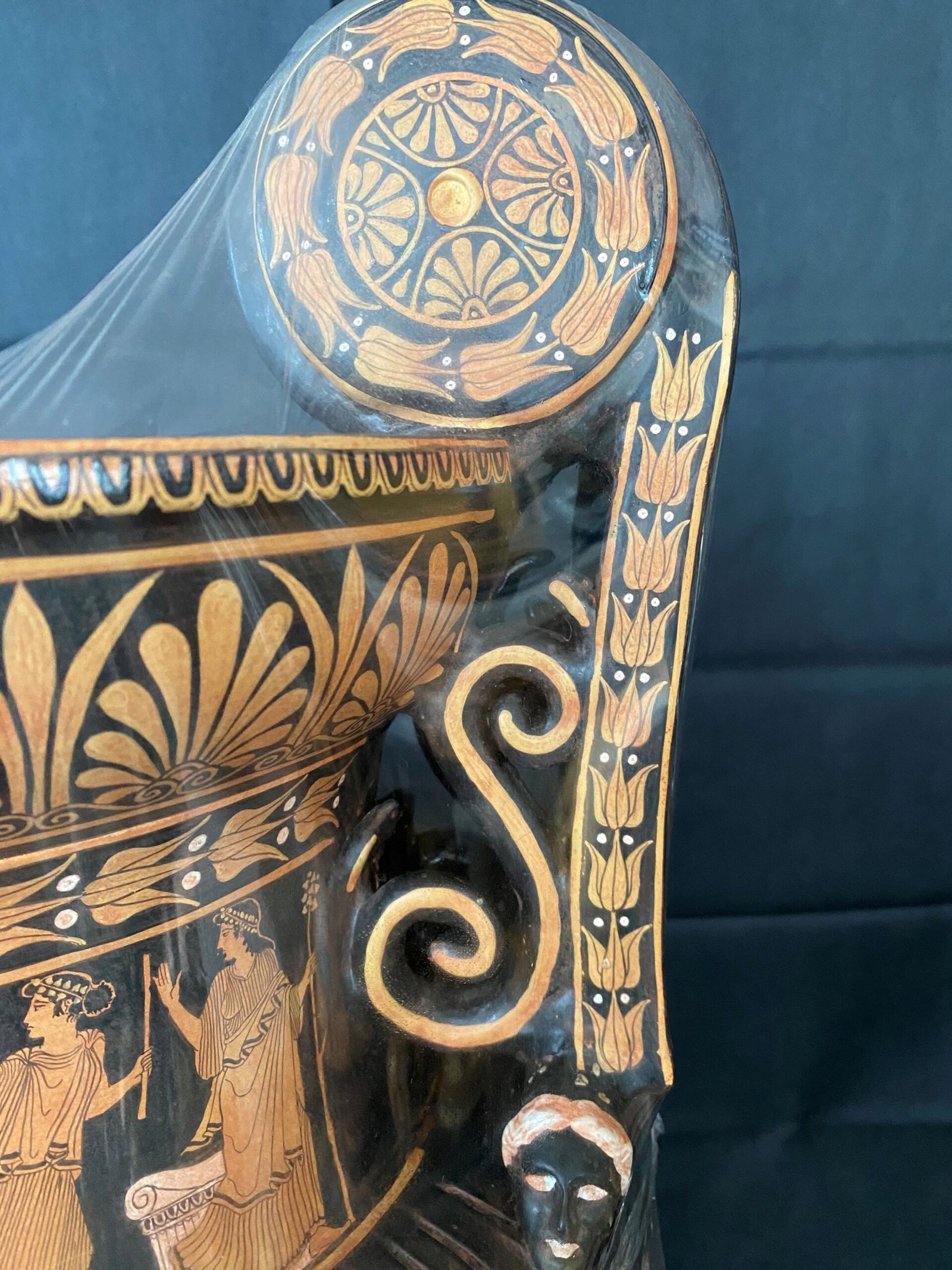 Many aspects of this vessel, notably the ribbing on the surface of the bowl and the ornate handles, are more typical of vases produced in South Italy than in Athens, perhaps indicating that it was made for export to that area. Added clay relief was used for the ivy pattern just below the mouth on side A, as well as the wreath of olive leaves that encircles the bowl, while at the junction between the body and the base of each handle is a small sculptural head of a Black African youth – a popular image in Southern Italy during the fourth century, found also on gems and jewelry. Many details are also embellished with gilding, such as the hair of the Black African youths, the bracelets, earrings, and necklaces worn by the figures in the painted scenes, and the minuscule frontal female faces at the center of each handle. For the krater’s ancient owner, all of these features would have lent a luxurious appeal, evoking the more costly creations of silversmiths and metalworkers.