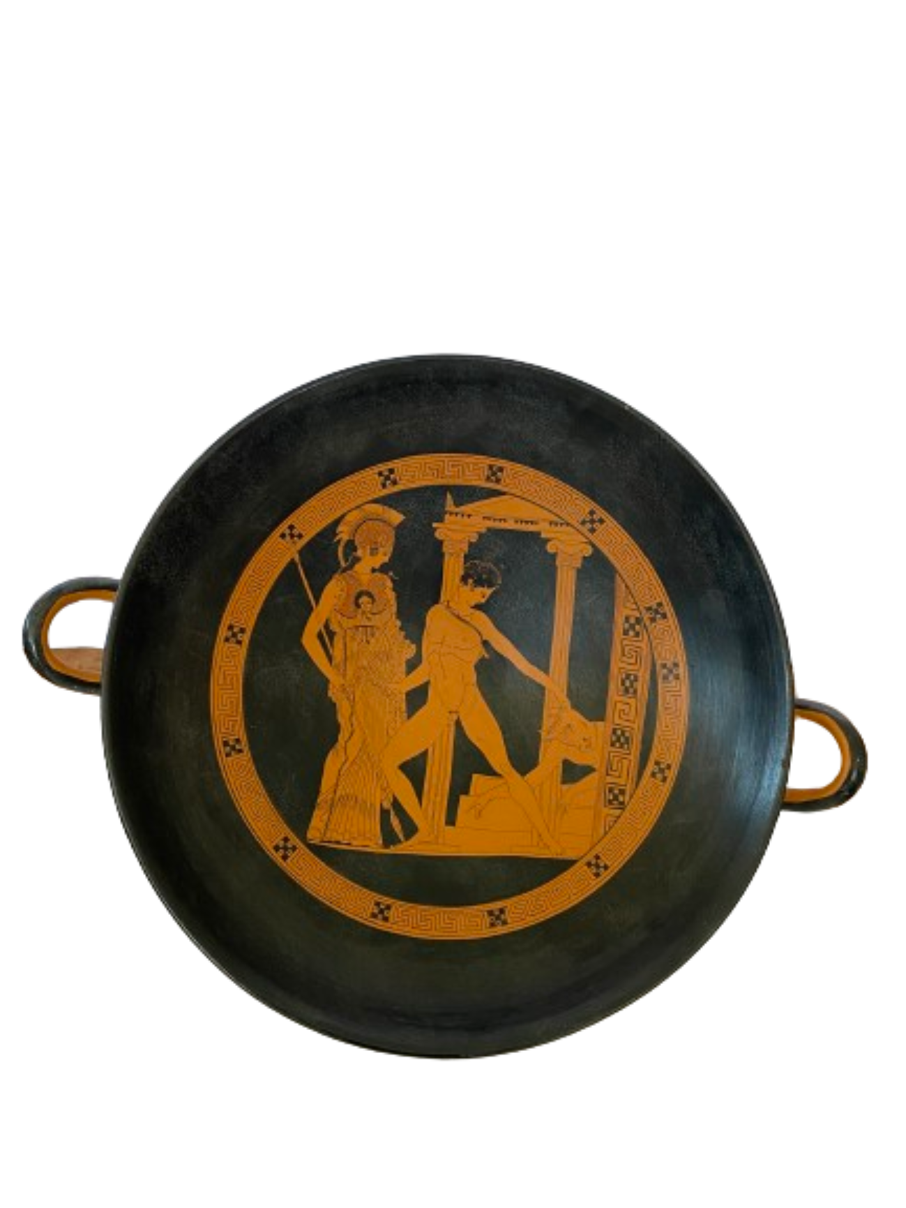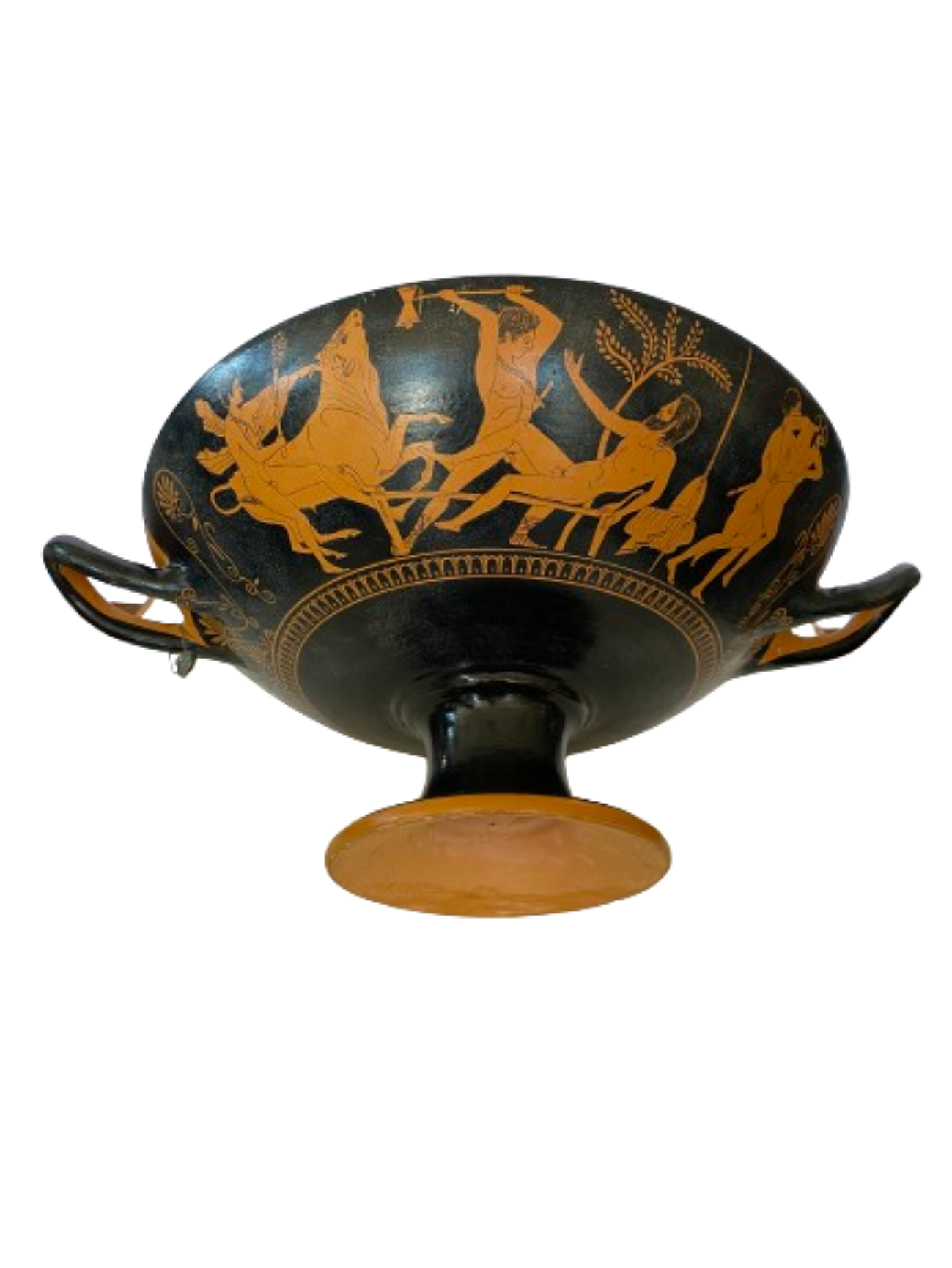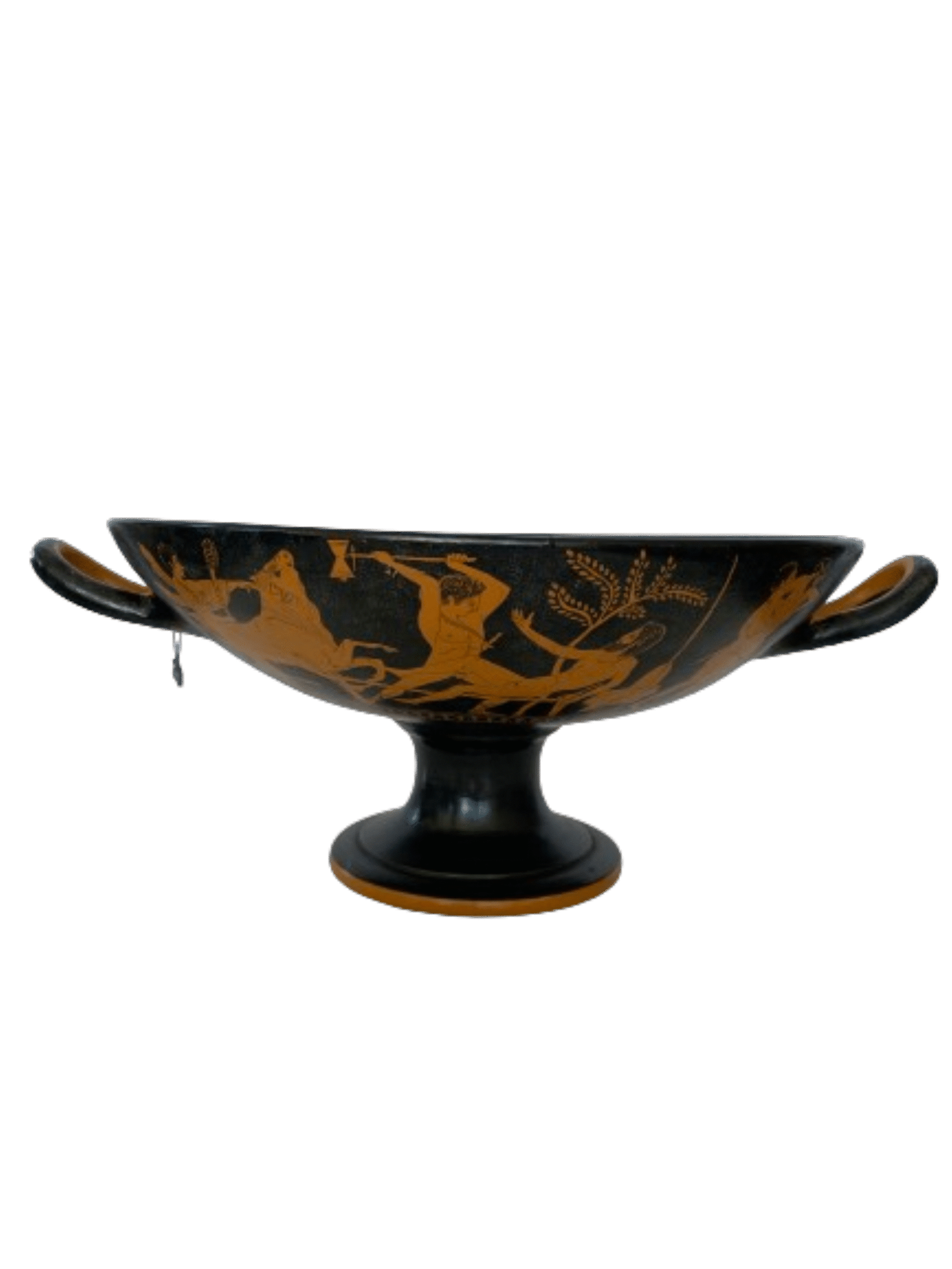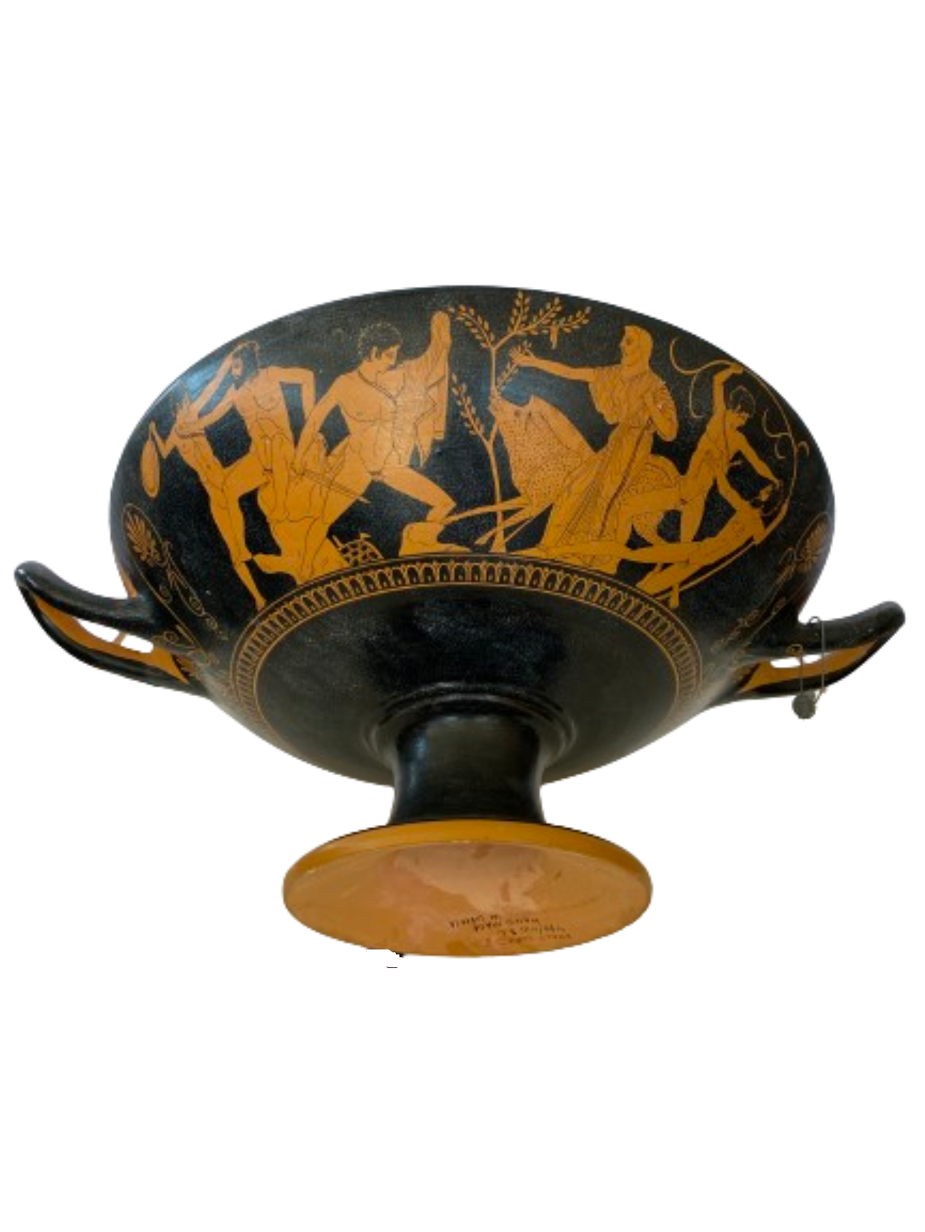 This Kylix shows the victory of Theseus over the Minotaur in the presence of Goddess Athena.