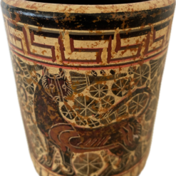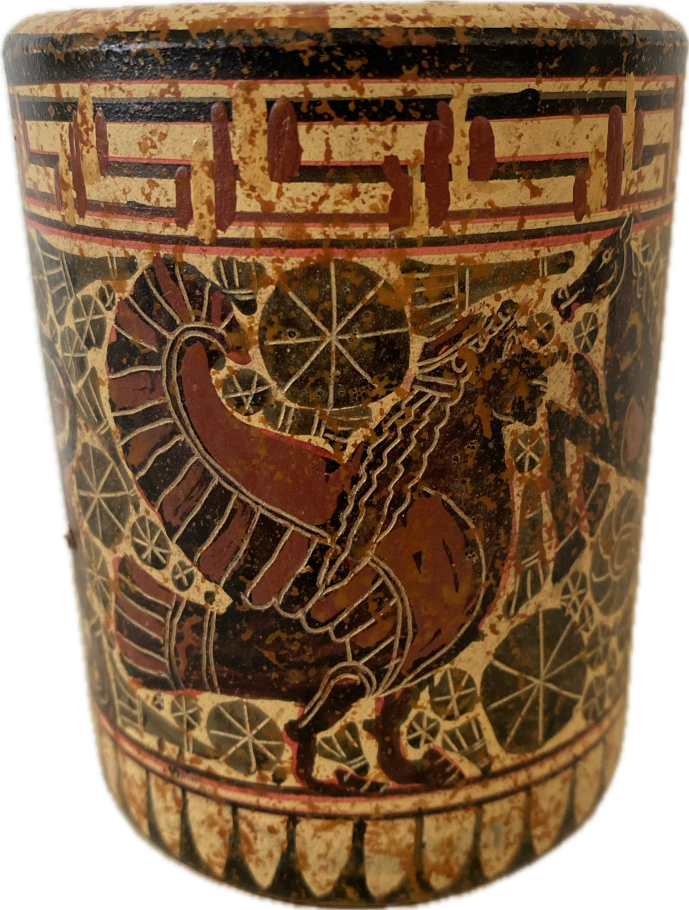 It is decorated with animals, ( Pegasus, lion, sphinx ) and geometric designs. ( Meander design , spears).