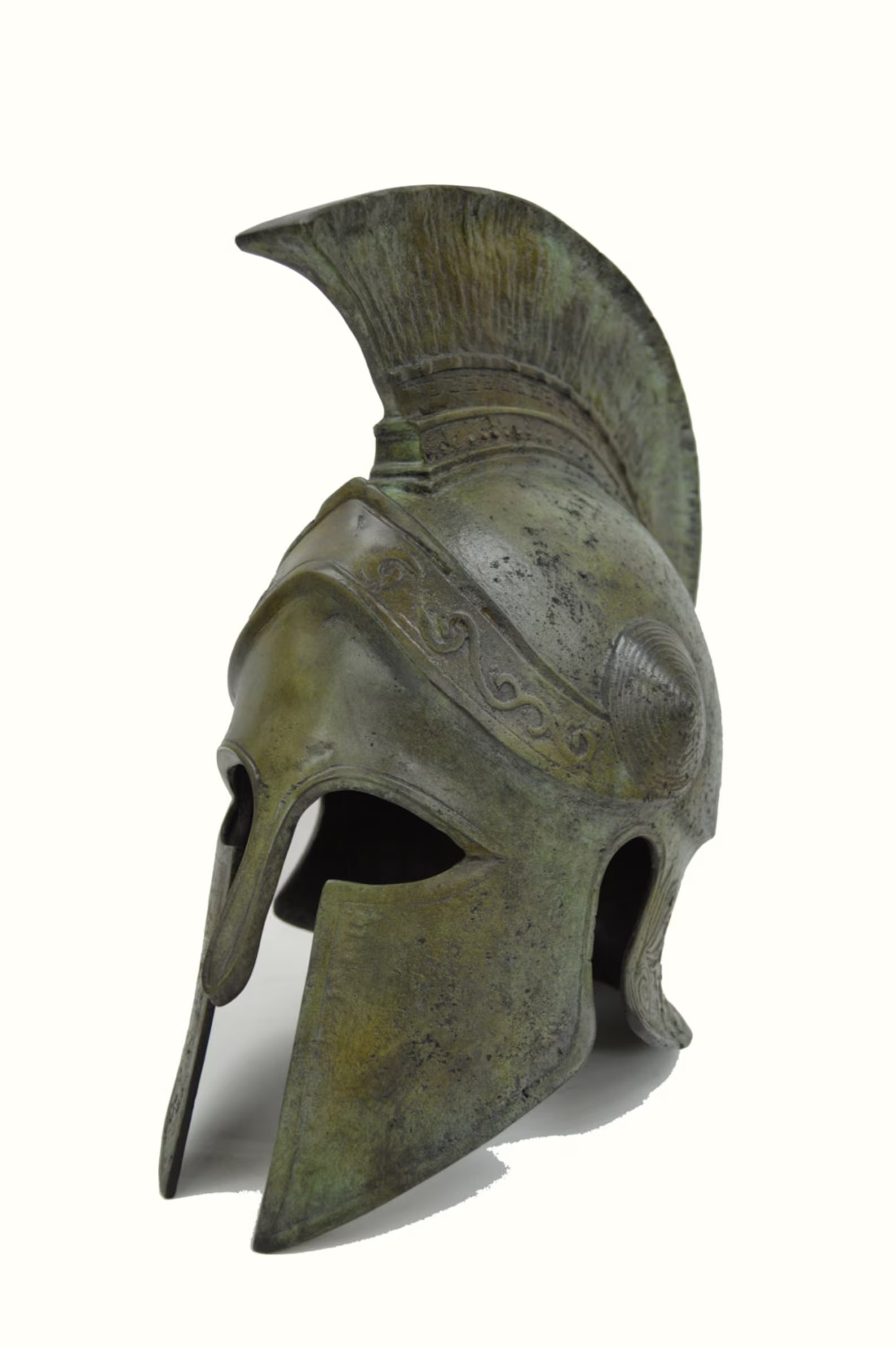 Corinthian officer’s helmet with crest. Its sides are decorated with geometric spiral designs.