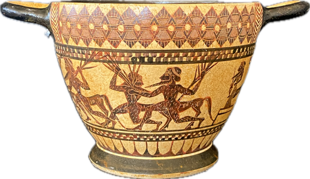 The performance depicts the natural landscape in front of the entrance of a cave. A jar is buried in the ground up to the waist. Above the jar hangs the weapons of Hercules, his bow, quiver and sword. In front of the entrance to the cave is the centaur Folos, facing left. He wears a crown on his head and a long cloak. He holds a grape in his left hand, while with his right hand he makes a sudden movement, seeing Hercules forcibly expel eleven Centaurs from the cave. Hercules is depicted bearded and naked, firing flaming torches to the left at the fleeing Centaurs. The torches are piled on the lit altar in front of the cave. The centaurs are depicted with long beards and human bodies. They are armed with branches and tree roots. One of the centaurs has fallen to the ground. Some of the Centaurs have their heads turned to the right and are looking behind them as they flee with the others to escape. At the far left of the performance we see a woman along with a bearded man holding a scepter watching the paradoxical event.