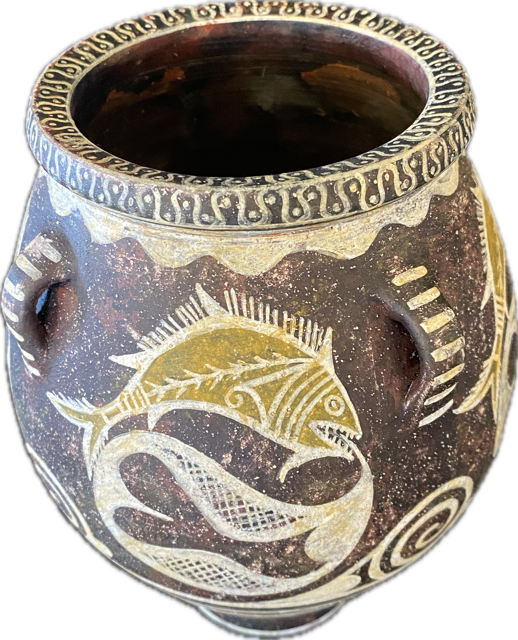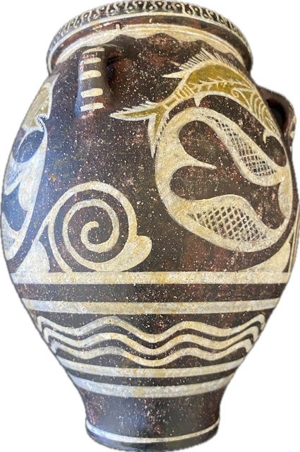 Minoan pithos decorated with fish caught in a net.