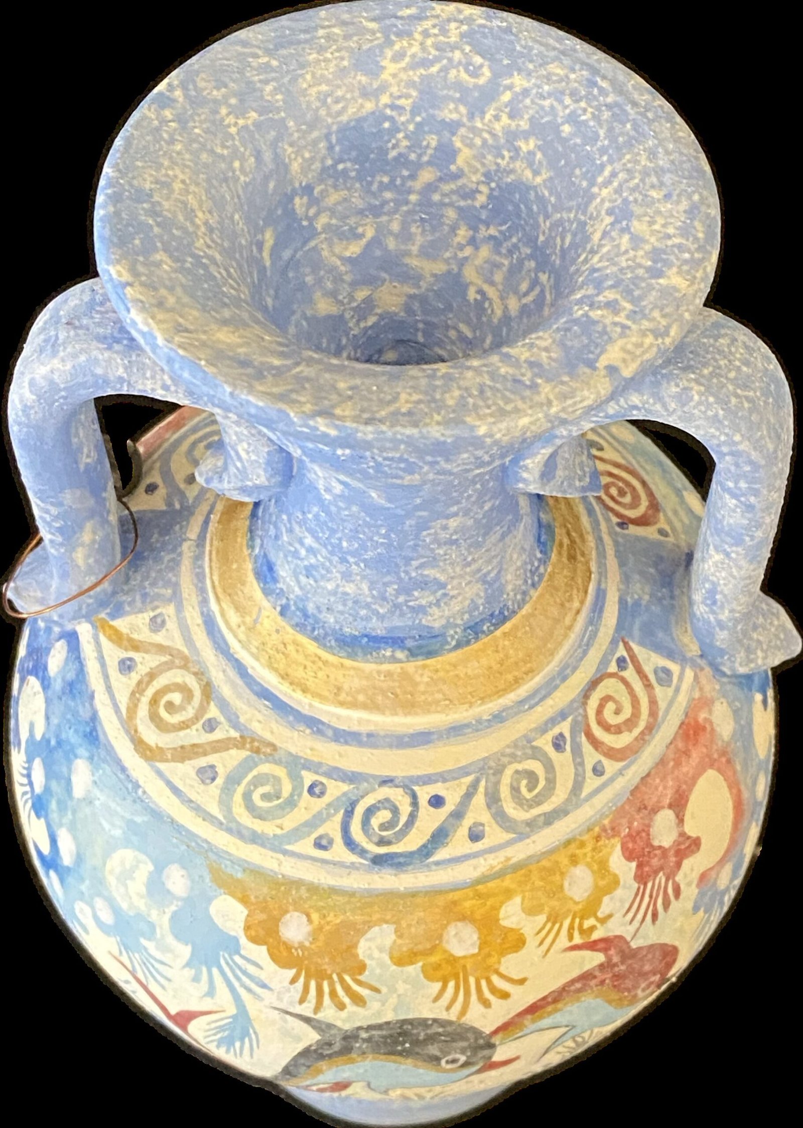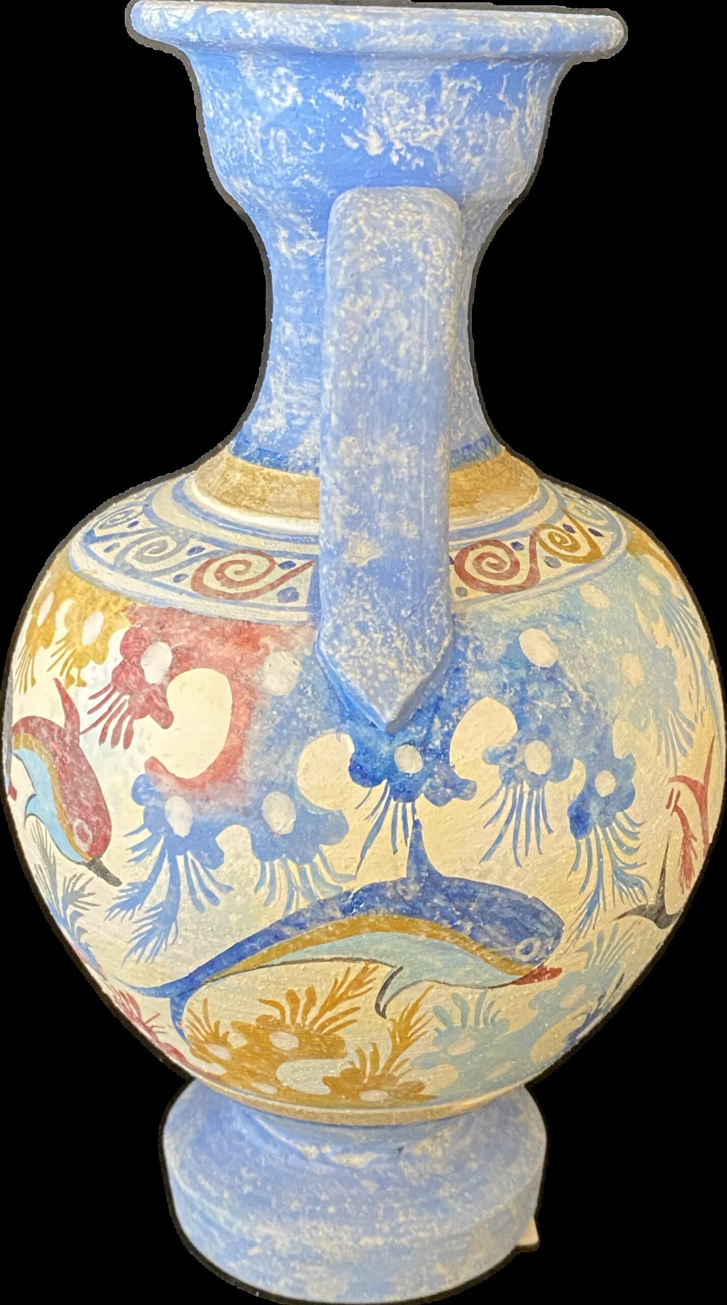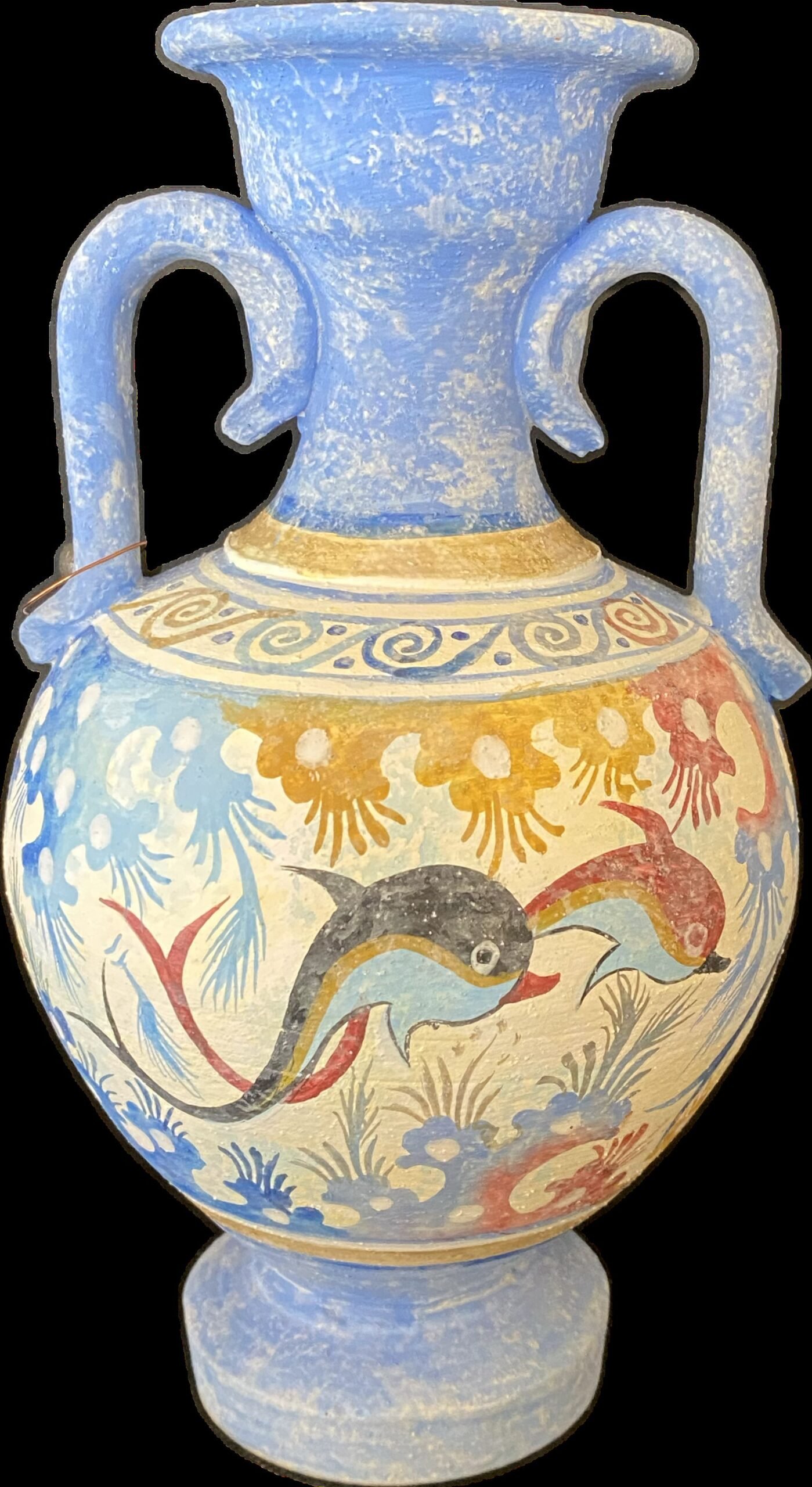 Dolphins playing around the seabed. Around them there are sea anemones, corals, and seaweed.