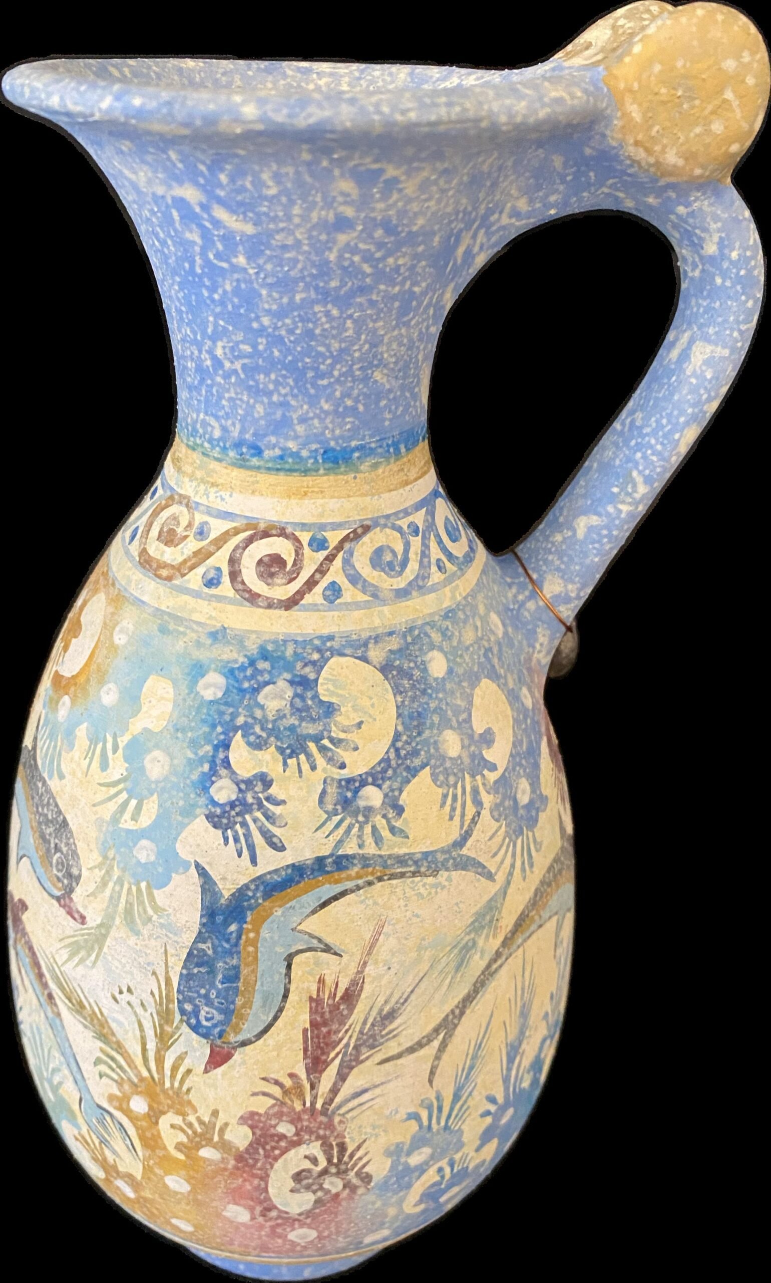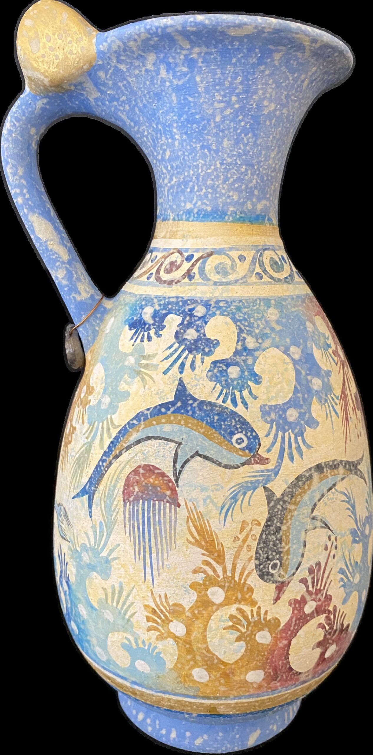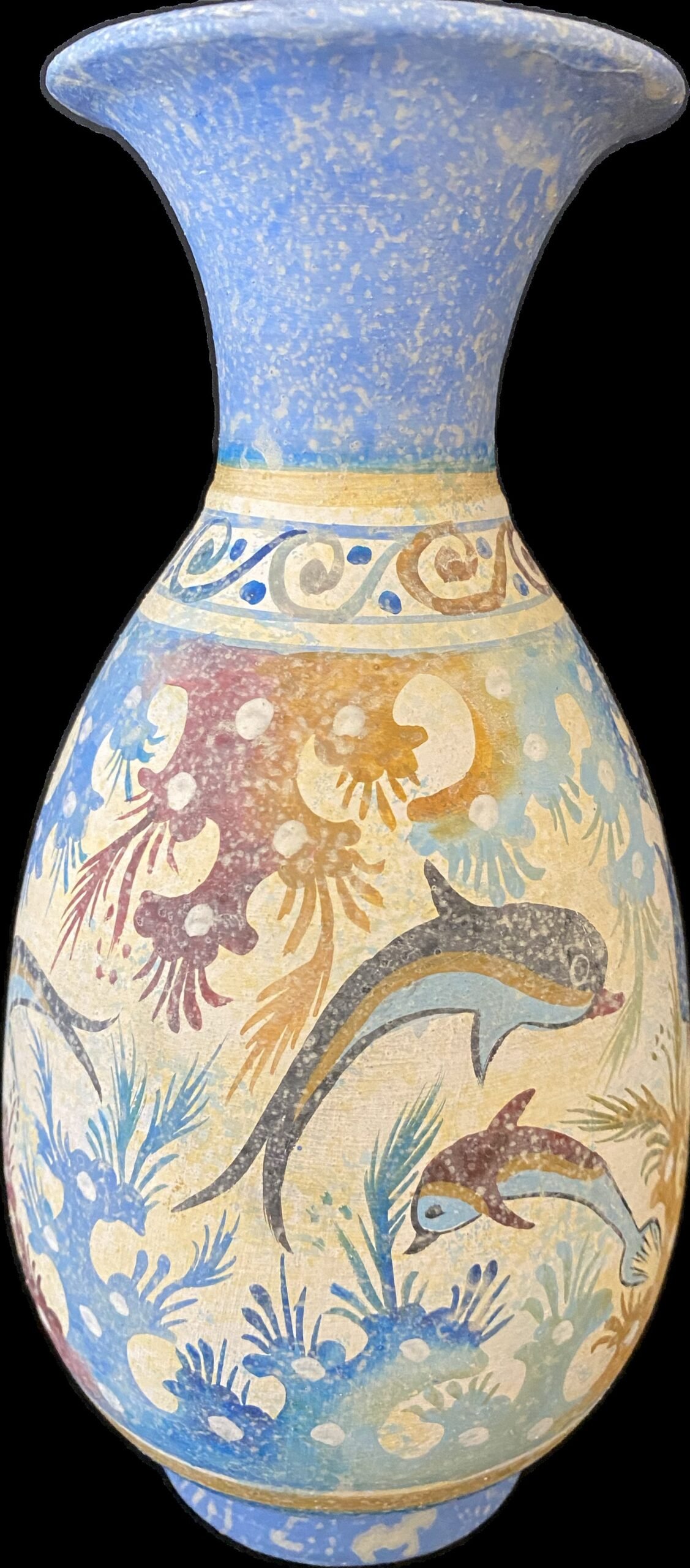 Dolphins playing around the seabed. Around them there are sea anemones, corals, and seaweed.